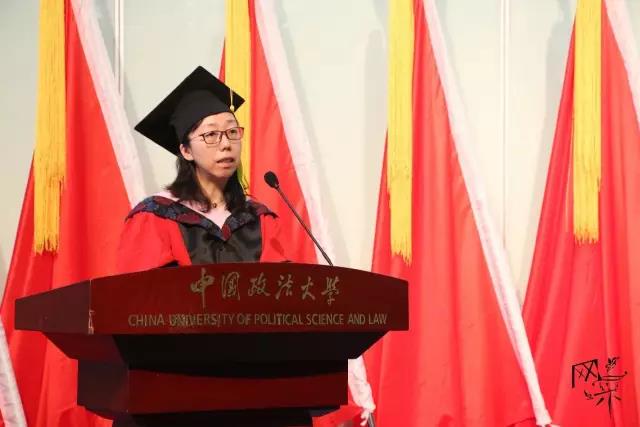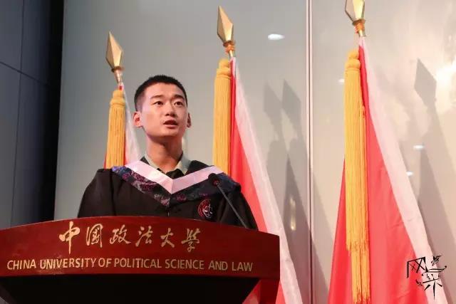 随着王敬川宣布典礼开始,全场起立,奏唱国歌。在高昂肃穆的国歌奏唱结束之后,毕业生代表杨博同学发言。杨博同学回忆了这四年法大的改变与在法大生活的点滴,并且表达了他对大学四年生活的眷恋。在发言的最后,杨博师兄说:“人生当有所为,有所不为,当为之时朝气蓬勃,不为之时心如止水,尚法治,明法理,博学之,慎行之。”这一番充满激情的话语引起了毕业生们的共鸣。