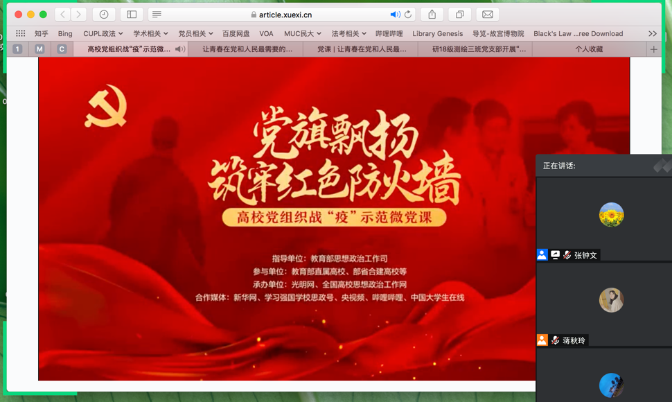 党支部书记张钟文结合往期党课,许多高校在抗疫战线中贡献出各自专业的力量,如同济大学搭建网络教学平台等,本次党课,正值中国共产党成立99周年,加上一些对于抗疫的回顾,在这个特殊的日子里,战斗在一线的抗疫人员折射出了共产党建党99周年依然有的蓬勃生命力,以及走过近百年历程的凝聚力和号召力。