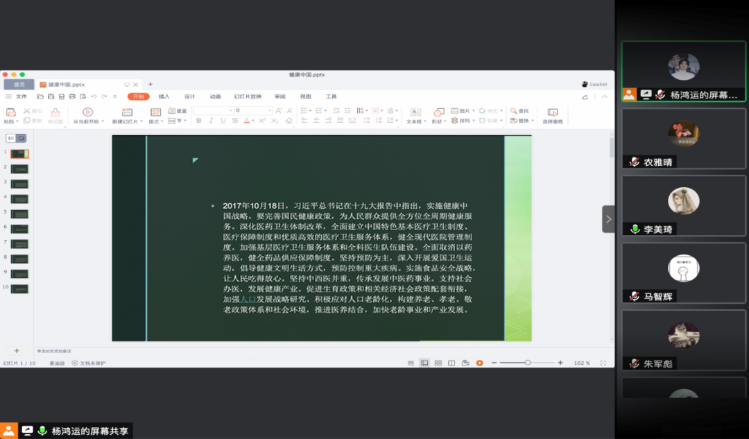 健康中国是习近平总书记在党的十九大报告中提出的发展战略,强调人民健康是民族昌盛和国家富强的重要标准。健康中国不仅是提升国力不可或缺的重要内容,也是关系到我们每一位公民个人发展和家庭幸福的必要议题,再加上此时正值疫情特殊期间,国民健康意识、公共卫生建设等与“健康中国”息息相关的现实话题如此真实地摆在了所有与会人员的眼前,因此在会议开始前,党员们就对此主题十分重视,自主进行了相关资料的检索。